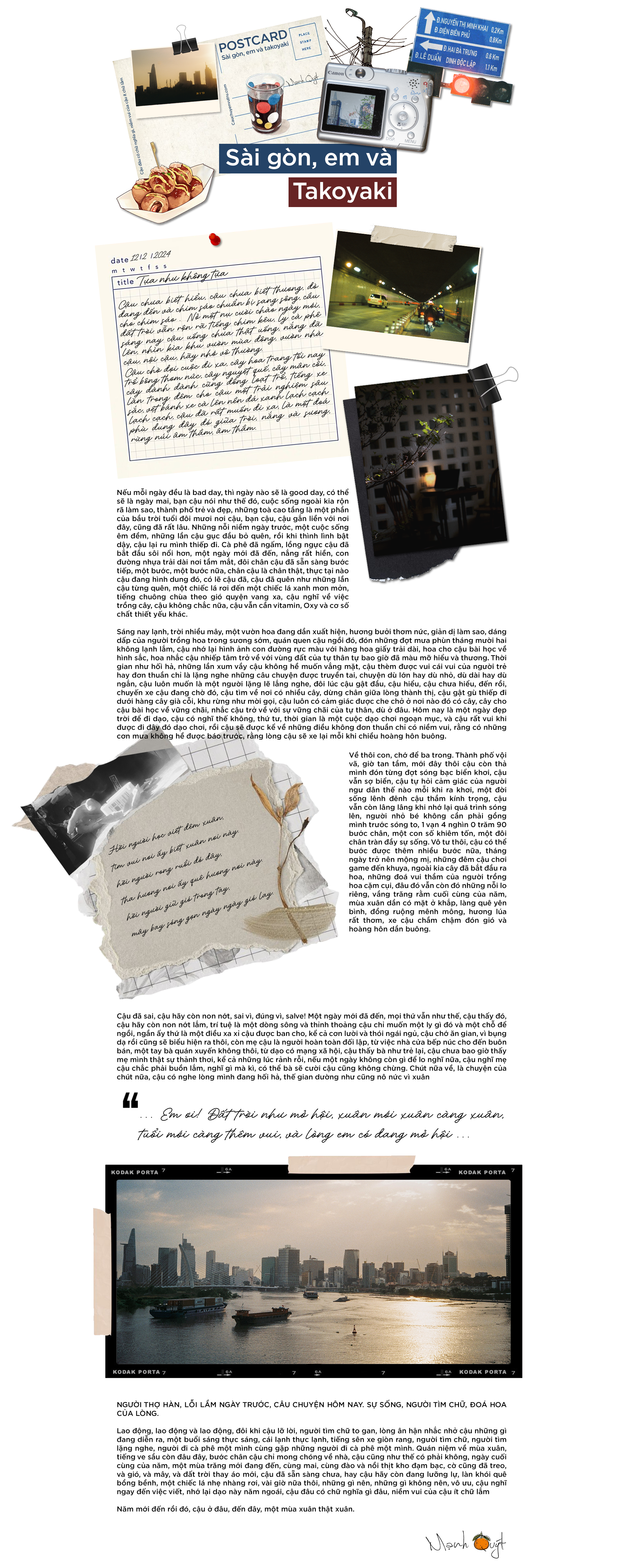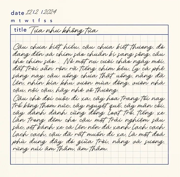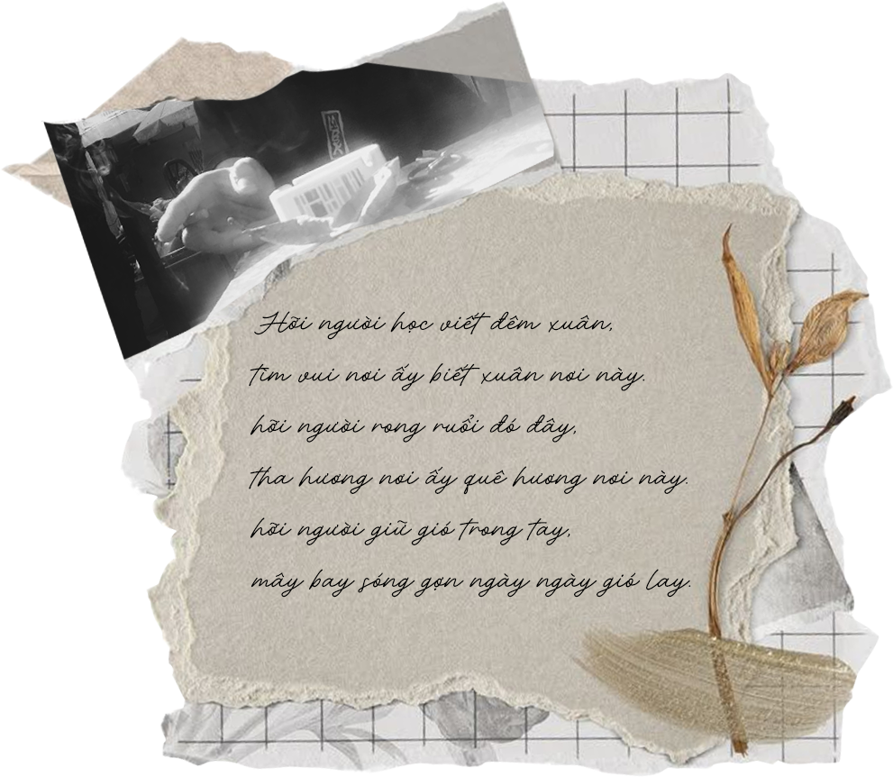 Lao động, lao động và lao động, đôi khi cậu lỡ lời, người tìm chữ to gan, lòng ân hận nhắc nhở cậu những gì đang diễn ra, một buổi sáng thực sáng, cái lạnh thực lạnh, tiếng sên xe giòn rang, người tìm chữ, người tìm lặng nghe, người đi cà phê một mình cùng gặp những người đi cà phê một mình. Quán niệm về mùa xuân, tiếng ve sầu còn đâu đây, bước chân cậu chỉ mong chóng về nhà, cậu cũng như thế có phải không, ngày cuối cùng của năm, một mùa trăng mới đang đến, cùng mai, cùng đào và nồi thịt kho đạm bạc, cờ cũng đã treo, và gió, và mây, và đất trời thay áo mới, cậu đã sẵn sàng chưa, hay cậu hãy còn đang lưỡng lự, làn khói quê bồng bềnh, một chiếc lá nhẹ nhàng rơi, vài giờ nữa thôi, những gì nên, những gì không nên, vô ưu, cậu nghĩ ngay đến việc viết, nhớ lại dạo này năm ngoái, cậu đâu có chữ nghĩa gì đâu, niềm vui của cậu ít chữ lắm.